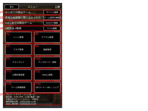 プレイ数、クリア数、いいね数、脱出率、平均クリアタイム、最速クリアタイム、作者以外のヒントコメント許可/不許可、最終更新日時、初回公開日時が表示されます。