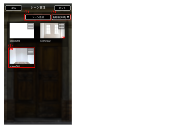 管理画面上のシーンを並び変えることができます。「名称順(降順)」「名称順(昇順)」「作成順(降順)」「作成順(昇順)」を切り替えることができます。