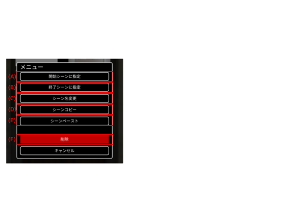 (F)シーンを削除します。当該シーンが他のシーンやイベントから移動先に指定されている場合は削除できません。移動の指定を解除してから削除を実施してください。