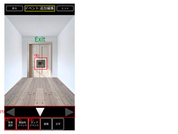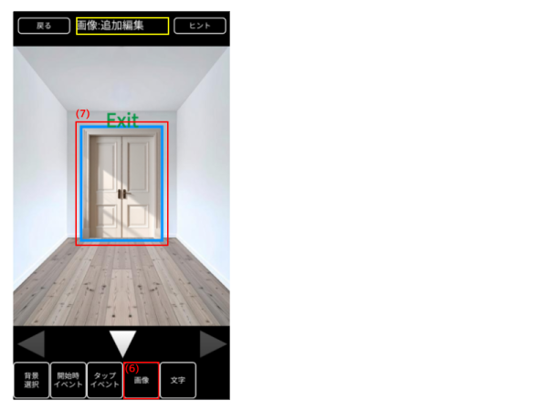 白枠内をタップするとタップイベント編集画面が表示されます。タップイベントはゲームのプレイ時に白枠内をタップすると実行されます。プレイ時にはタップイベントの白枠は表示されません。