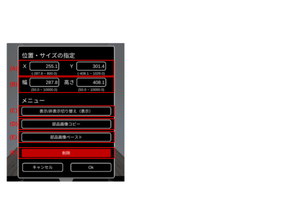 (B)部品画像の幅と高さを表示、入力して指定することができます。白枠の下部は最小値と最大値です。