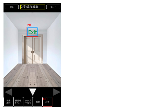 8.テキストに関する操作を行う際にタップします。タップすると「文字:追加編集」→「文字:拡大縮小」→「文字:移動」の順に切り替わります。現在の状態は画面上部中央(黄枠)に表示されます。