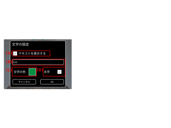 (A)テキストの表示状態(表示/非表示)を切り替えることができます。非表示状態の場合、シーン編集画面では表示されていますが、プレイ時には表示されません。