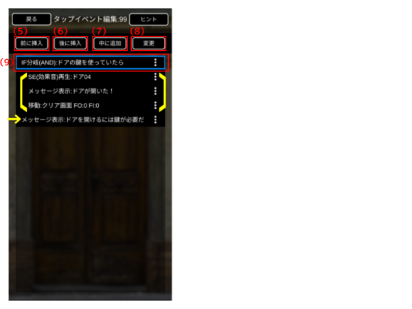 選択している行のイベントに関する設定内容を変更するための画面が表示されます。IF分岐の行を選択している場合にこの「変更」をタップすると、IF分岐条件編集画面へ遷移します。