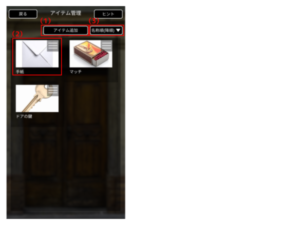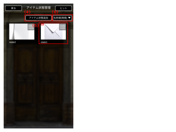 アイテム状態を並び変えることができます。「名称順(降順)」「名称順(昇順)」「作成順(降順)」「作成順(昇順)」を切り替えることができます。