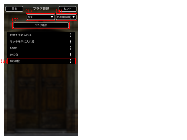 フラグを並び変えることができます。「名称順(降順)」「名称順(昇順)」「作成順(降順)」「作成順(昇順)」を切り替えることができます。